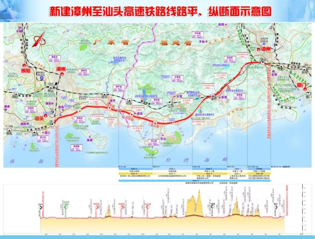 漳汕高鐵項目北接福廈高鐵,南連汕汕高鐵,全長約175公里(福建段全部在漳州市境內,長約127.2公里),共設漳州、漳浦、東山縣、詔安南、饒平南、汕頭東、汕頭等7座車站(漳州、漳浦、汕頭為既有站,汕頭東為預留站,其余為新建站),設計時速350公里,計劃工期4.5年。