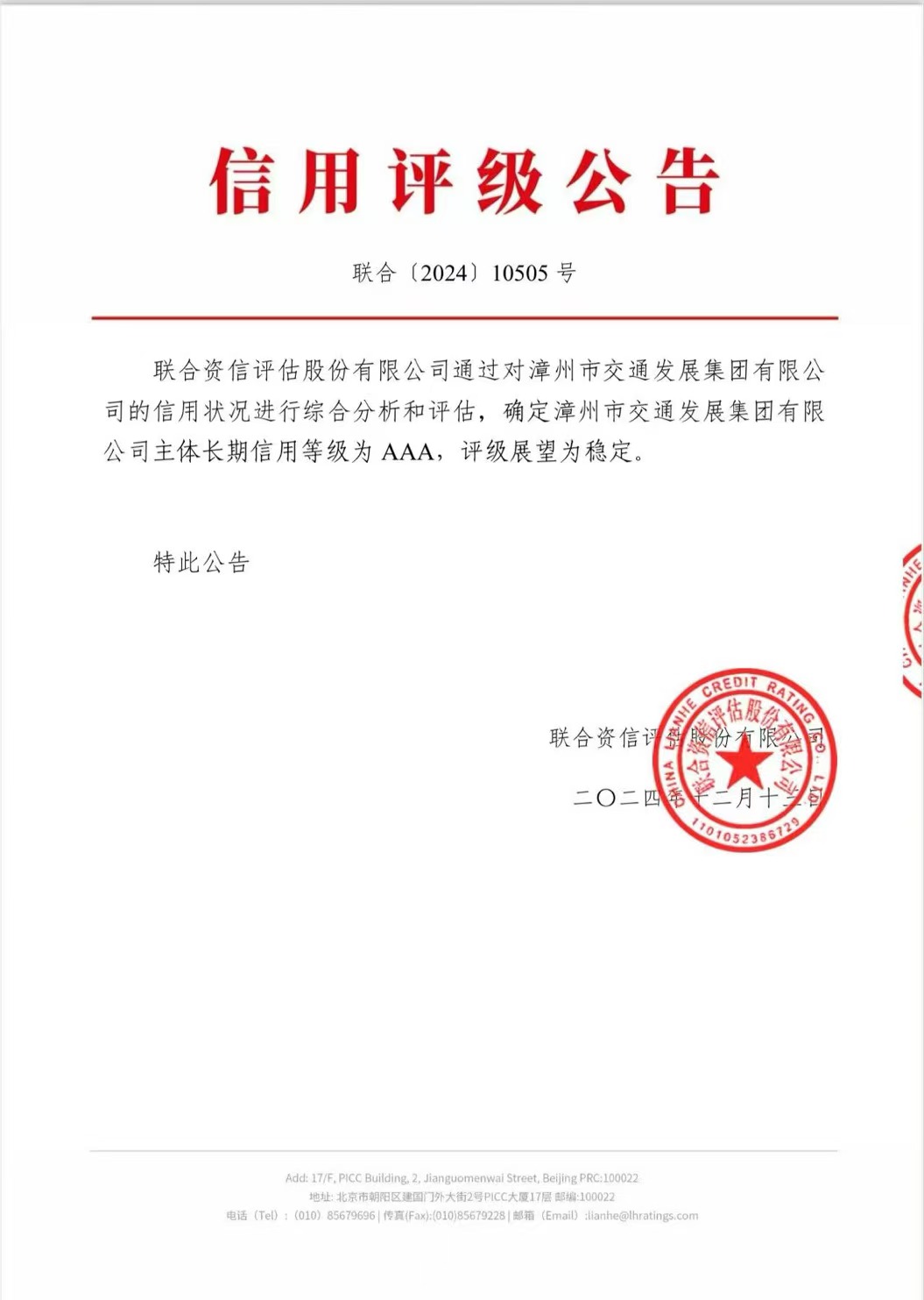 聯合資信是國內最專業、最有影響力、最具權威的信用評級機構之一。聯合資信授予漳州交通集團AAA信用等級的認證,充分體現了國內信用領域對漳州市交通發展集團有限公司綜合實力、信用水平、運營能力、轉型升級和發展前景等方面的高度認可。
