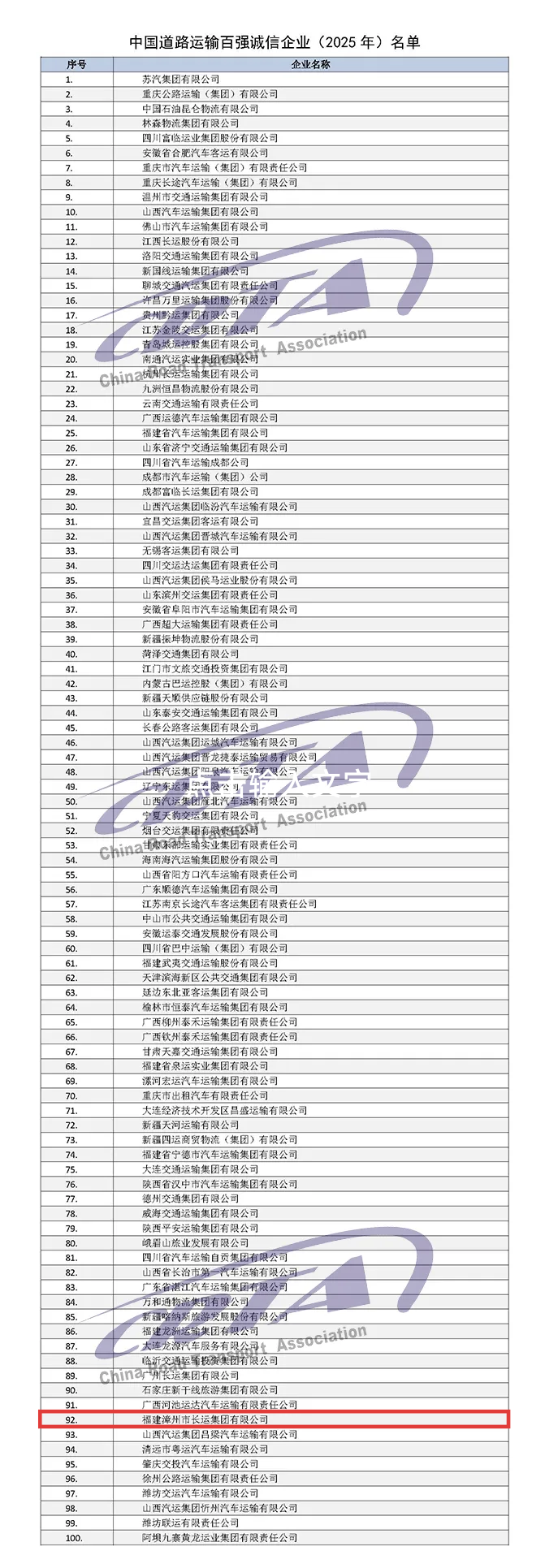 “中國道路運輸百強誠信企業”評價體系涵蓋企業規模實力、創新能力、社會公信及誠信經營等維度,由中國道路運輸協會主辦,是行業貫徹中央關于建設交通強國、推動現代流通體系發展決策部署的重要實踐,是國內道路運輸行業最具權威性和公信力的品牌活動之一。